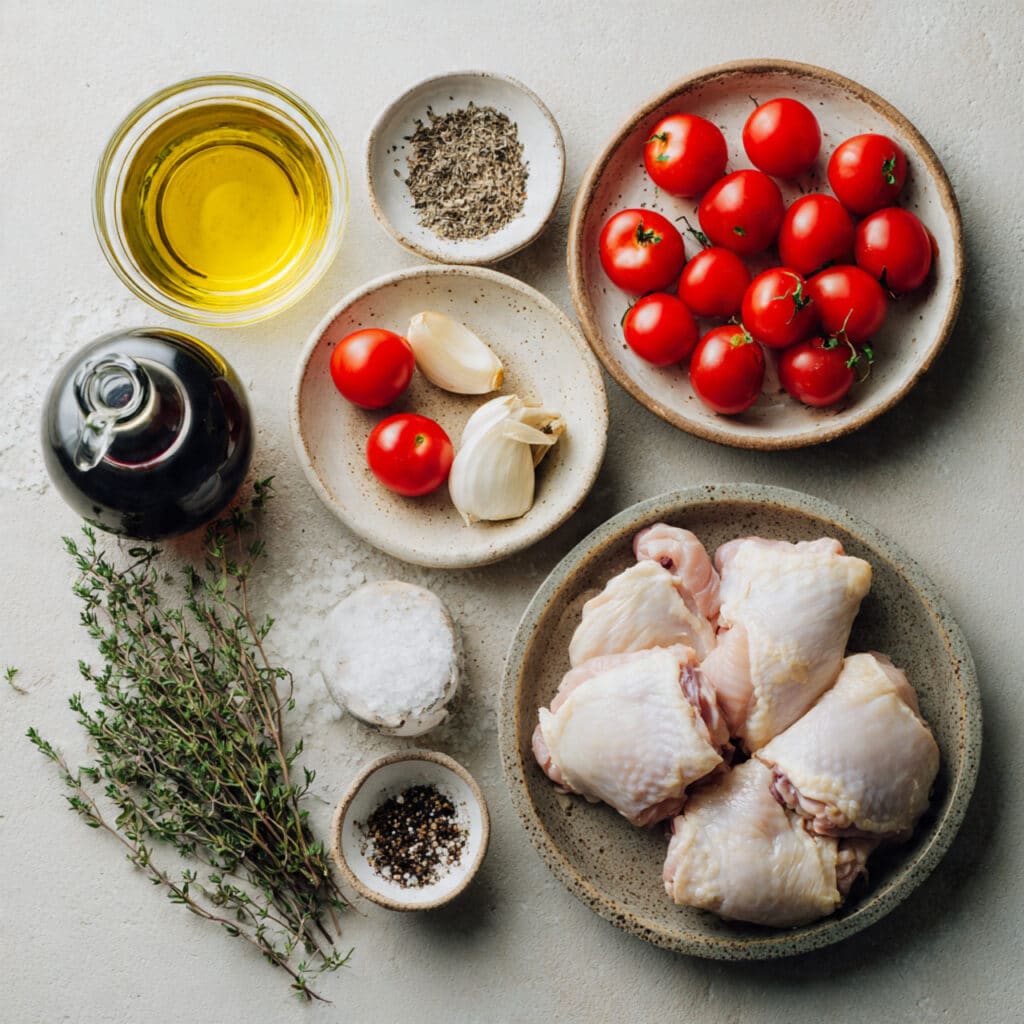 - Assemble the Dish: Place the chicken in the pan and sear until golden on both sides, then add garlic, cherry tomatoes, balsamic vinegar, and thyme.