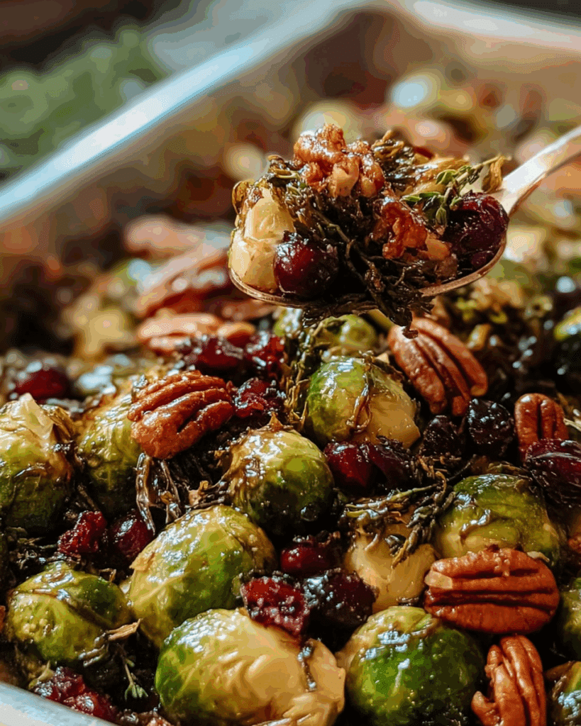Crispy roasted Brussels sprouts tossed in a sweet-tangy balsamic-maple glaze, finished with tart dried cranberries and toasted pecans for a festive, crunchy side dish.