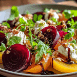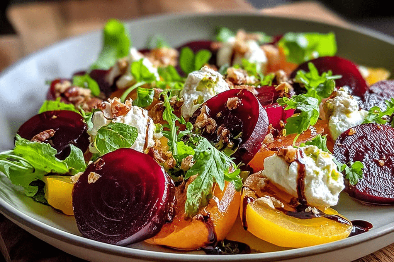 A vibrant roasted beet salad with creamy goat cheese, toasted walnuts, thinly sliced red onion, and a honey-balsamic vinaigrette, served over mixed greens. Bright, earthy, and perfect for a starter or light main.