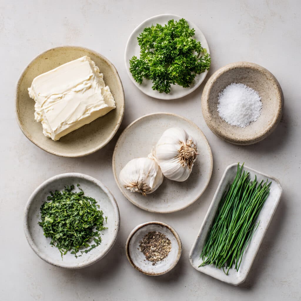 - In a mixing bowl, combine cream cheese, butter, garlic, parsley, chives, dill, salt, and pepper.