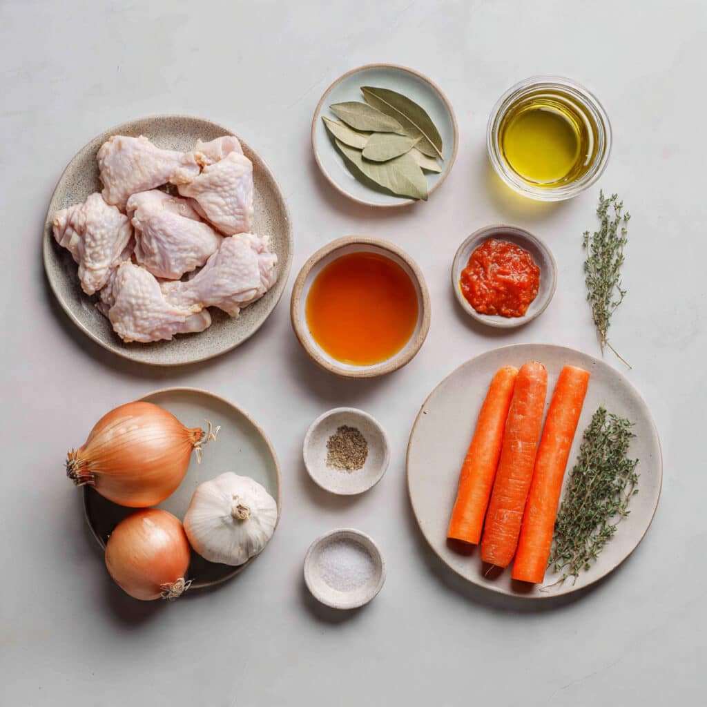 - Assemble the Dish: In the same pot, cook onions, carrots, and garlic until softened. Stir in tomato paste, then return the chicken. Add broth, thyme, and bay leaves.