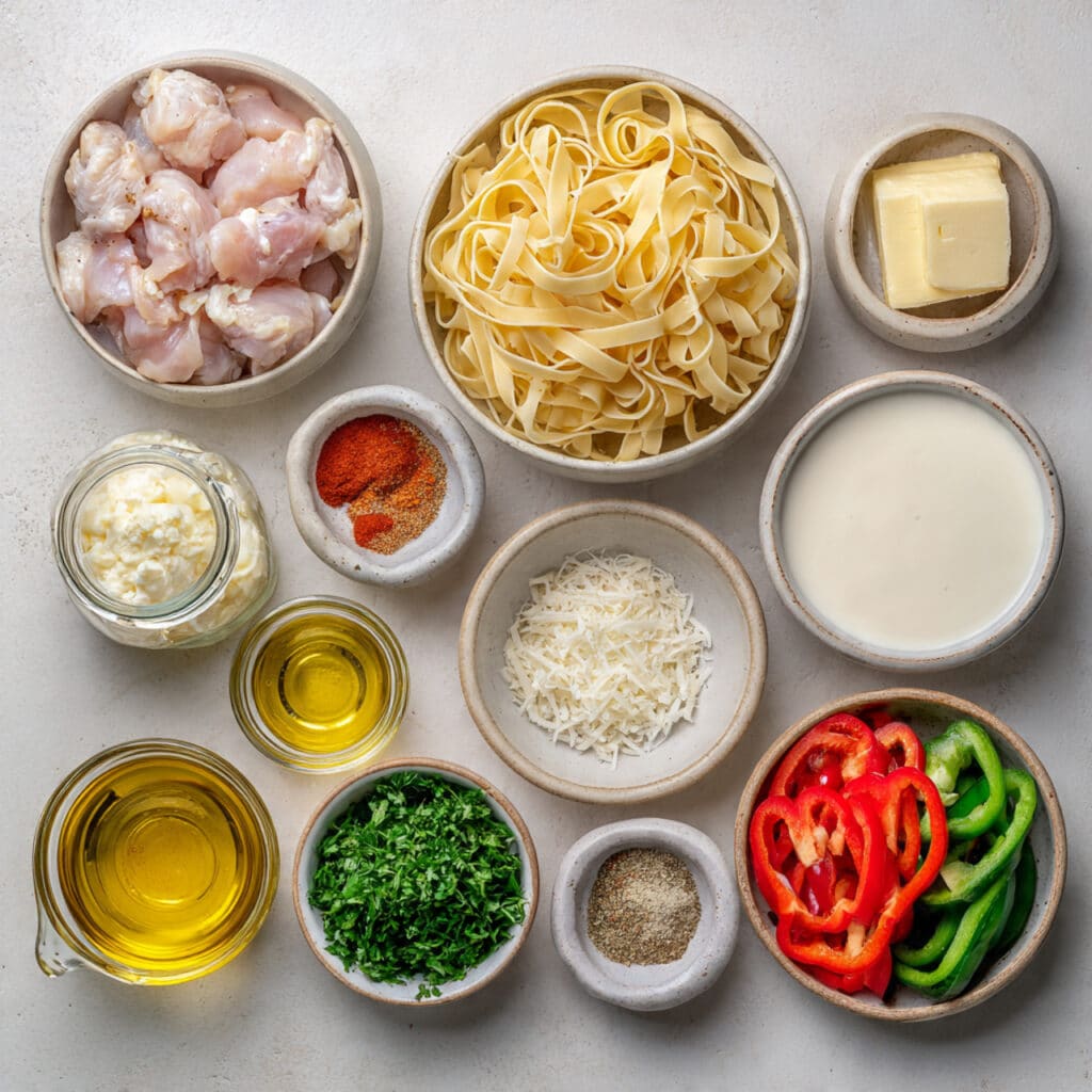 A rich and creamy Cajun Alfredo pasta packed with bold spices, tender chicken, and vibrant bell peppers, perfect for a comforting yet flavorful meal.