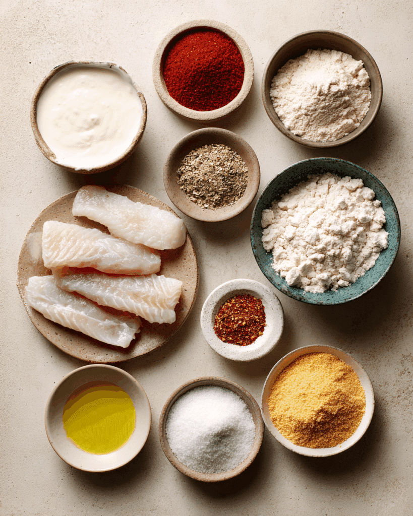 Creating these flavor-packed nuggets requires a mix of pantry staples and fresh catfish. Here’s everything you need to bring it all together: