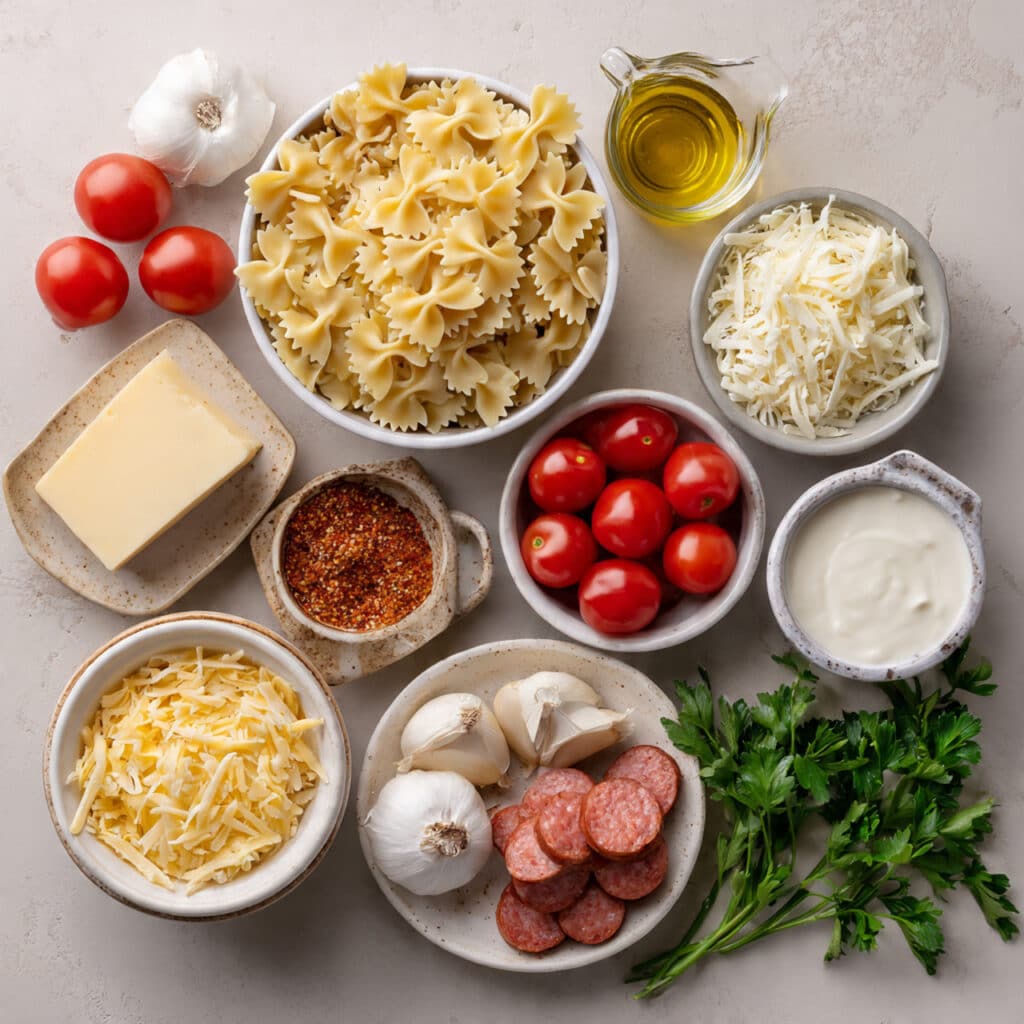 This pasta is all about contrast. The chewy bowtie noodles soak in that creamy, spiced sauce while the sausage gives every bite a smoky, savory punch. Cherry tomatoes add pops of juicy sweetness, and the melted cheese brings it all together with silky richness. It’s the kind of dish that keeps you going back for just one more bite.