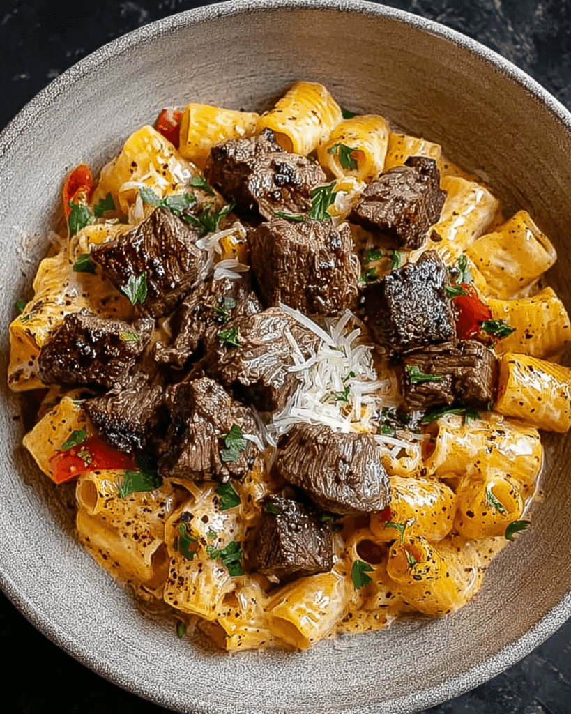 Tender Cajun-spiced steak tips meet creamy Parmesan rigatoni in this comforting and flavorful pasta dish that balances spice, richness, and heartiness in every bite.