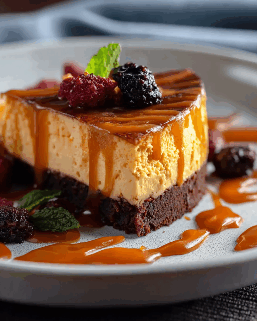 Presentation makes this dessert unforgettable. Drizzle caramel in a crisscross pattern, garnish with chocolate curls, and serve on a dark plate to make the golden caramel pop. A sprig of mint on top adds a fresh touch of color.