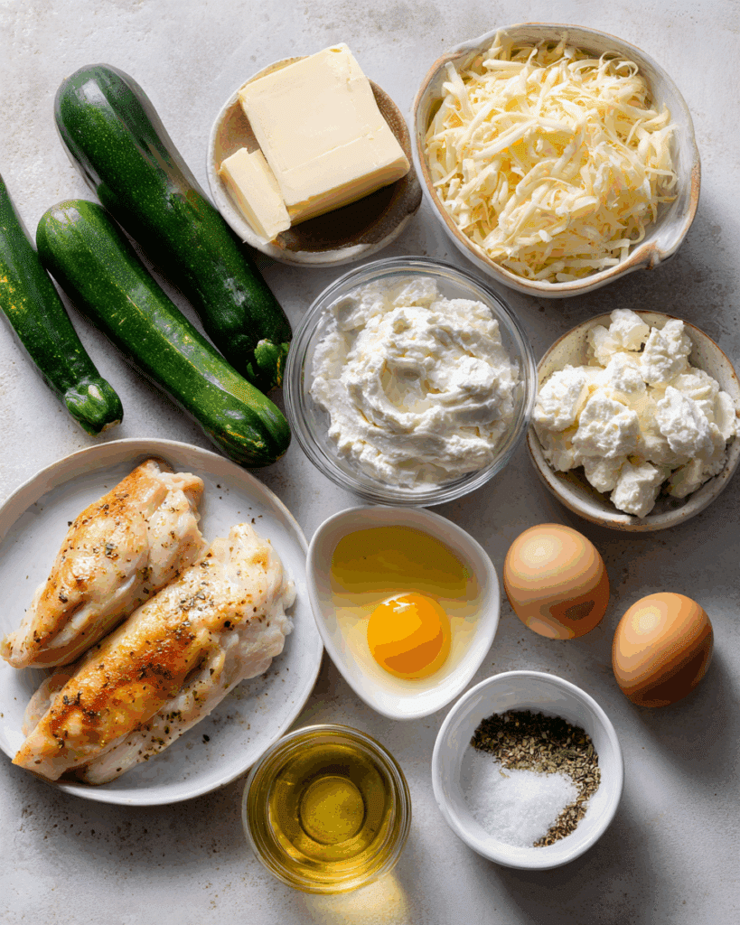 - In a large bowl, mix the chopped chicken, grated courgette, cheddar cheese, cream cheese, garlic powder, salt, and pepper until well combined.