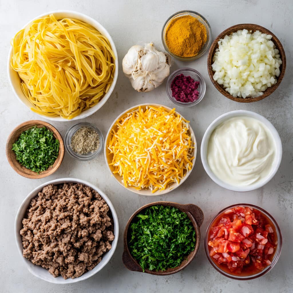 Each ingredient plays its part to create a creamy, cheesy, beefy explosion of flavor. Here’s what you’ll need:
