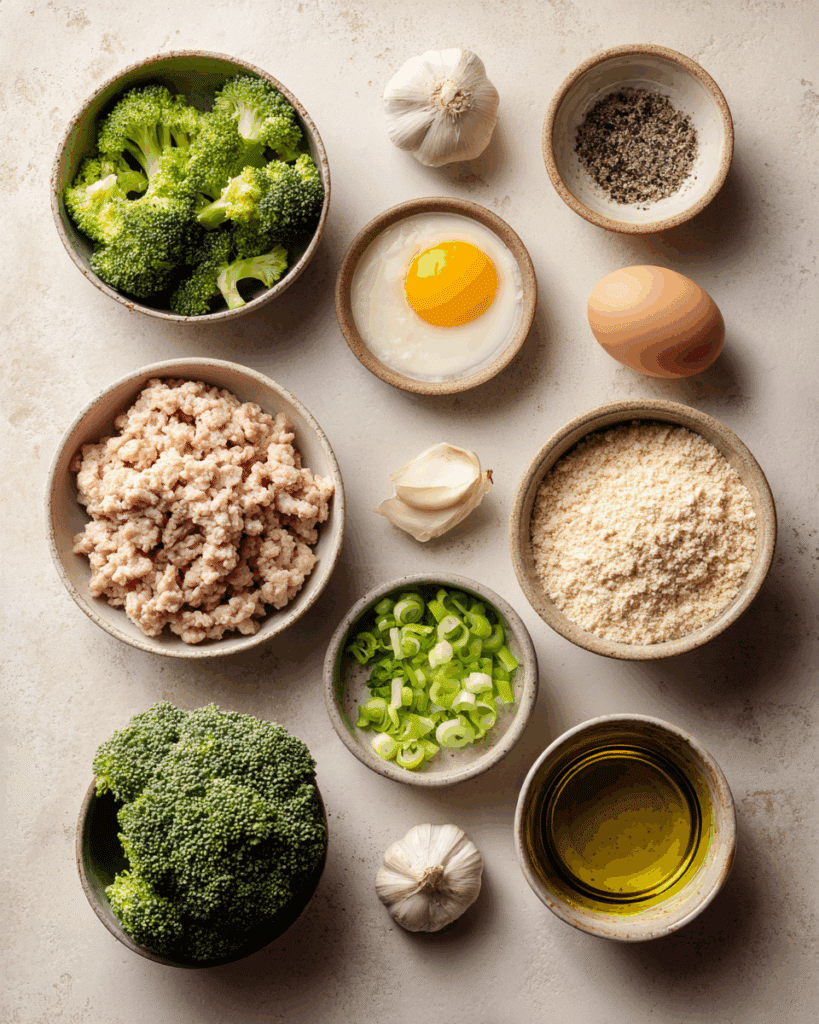 - In a large bowl, mix together ground chicken, chopped broccoli, garlic, green onion, breadcrumbs, egg, salt, and pepper until just combined.