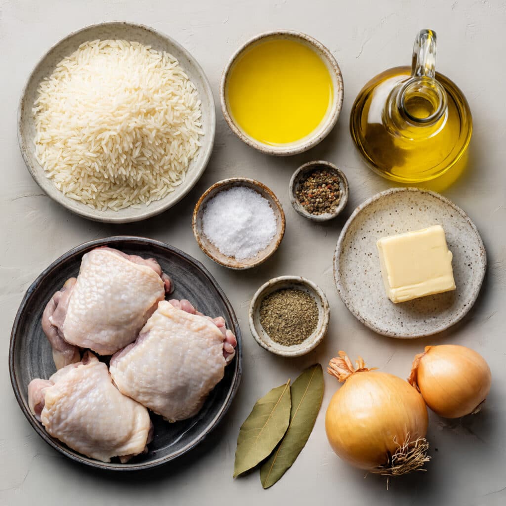 A comforting one-pan dish of tender chicken thighs nestled in fluffy, buttery rice with sweet caramelized onions and warm spices. Rich, satisfying, and perfect for any night of the week.