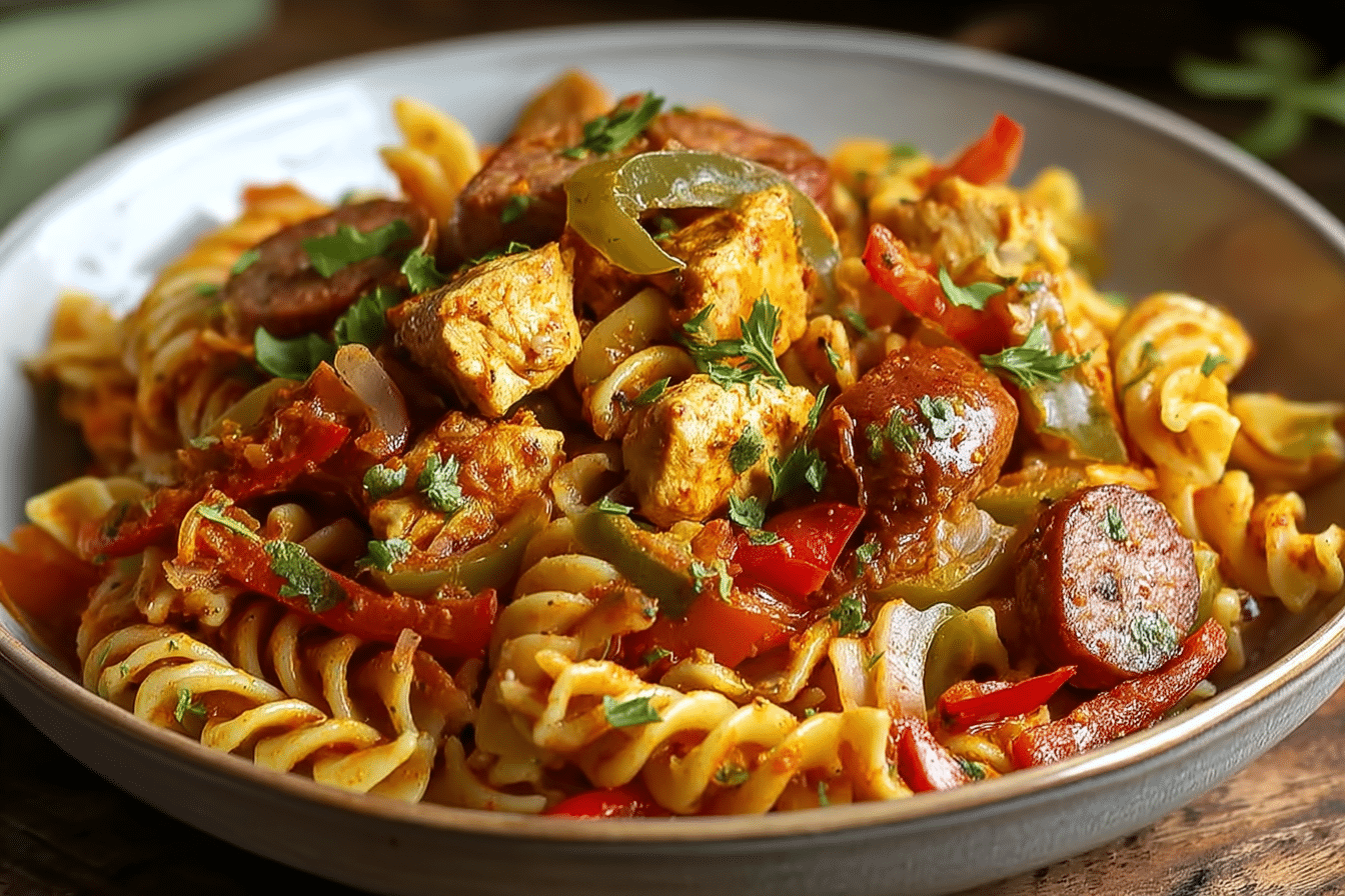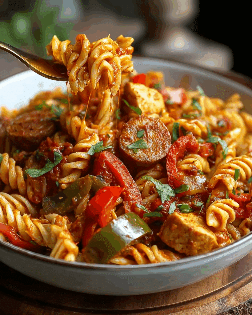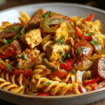 This recipe was born out of one of those “what’s in the fridge?” evenings. A couple of chicken breasts, some smoked sausage, and a bag of bell peppers just waiting to be used. Instead of choosing between fajitas or pasta, I thought, why not have both? What came out of the pan was a dish that quickly became a family favorite, full of comfort yet lively enough to make dinner feel like an occasion.