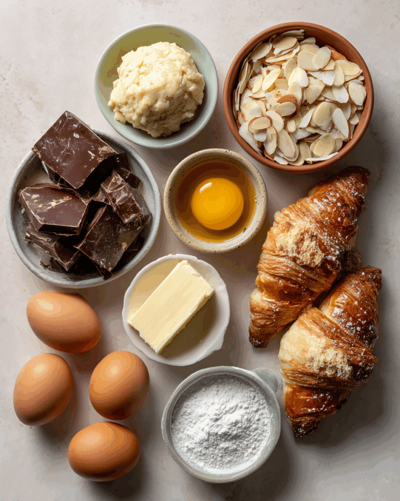Flaky, buttery chocolate almond croissants filled with rich dark chocolate and almond frangipane, topped with toasted almonds and a dusting of powdered sugar.