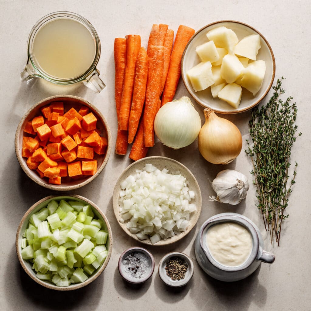 - Carrots: 3 medium, sliced for sweetness and texture