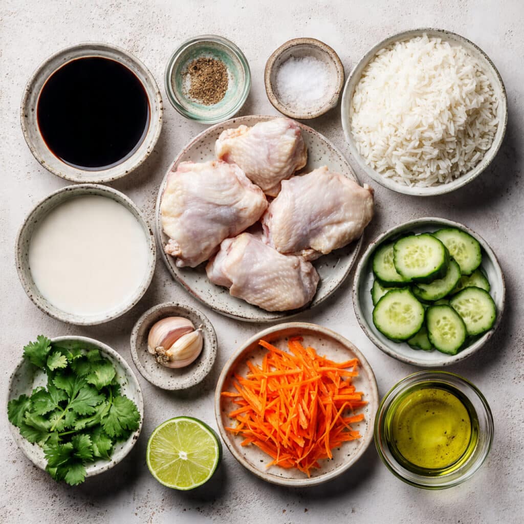 This comforting coconut chicken rice bowl blends tender chicken thighs in a rich, creamy coconut sauce with jasmine rice and fresh veggies like cucumber and carrots. It’s zesty, aromatic, and perfect for meal prep or weeknight dinners.