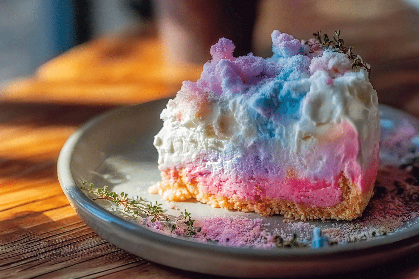 The crust gives a satisfying crunch, contrasting with the creamy, melt-in-your-mouth filling. The cotton candy extract weaves playful sweetness throughout, while the whipped cream keeps it light. The garnish of fresh cotton candy adds a delicate, melt-away texture that makes every bite magical.