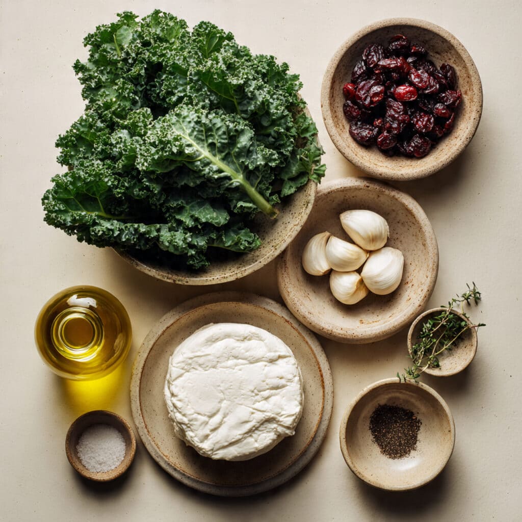 - Combine Ingredients: In a skillet over medium heat, warm the olive oil and sauté the garlic for 30 seconds. Add the chopped kale and cook until just wilted, then remove from heat and stir in the dried cranberries, goats cheese, salt, and black pepper.