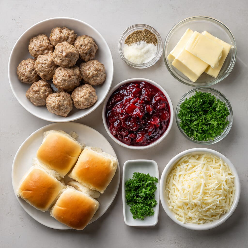 - Cooked Meatballs: 18–20 meatballs, homemade or frozen and reheated. These bring the hearty, juicy base to the slider.