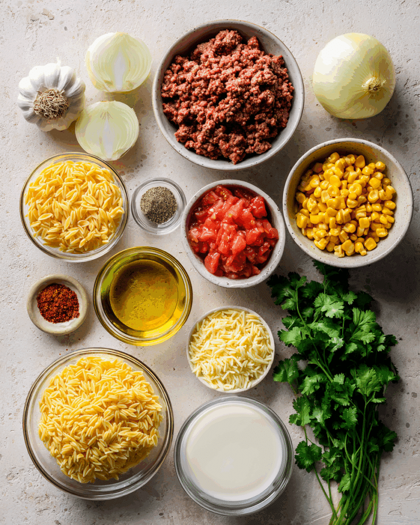 Each bite delivers contrast—soft, tender orzo meets juicy bursts of corn and the slight chew of browned beef. The creamy sauce binds everything together, while the taco seasoning punches through with bold, warm spices. A sprinkle of cheese on top adds the perfect gooey melt.
