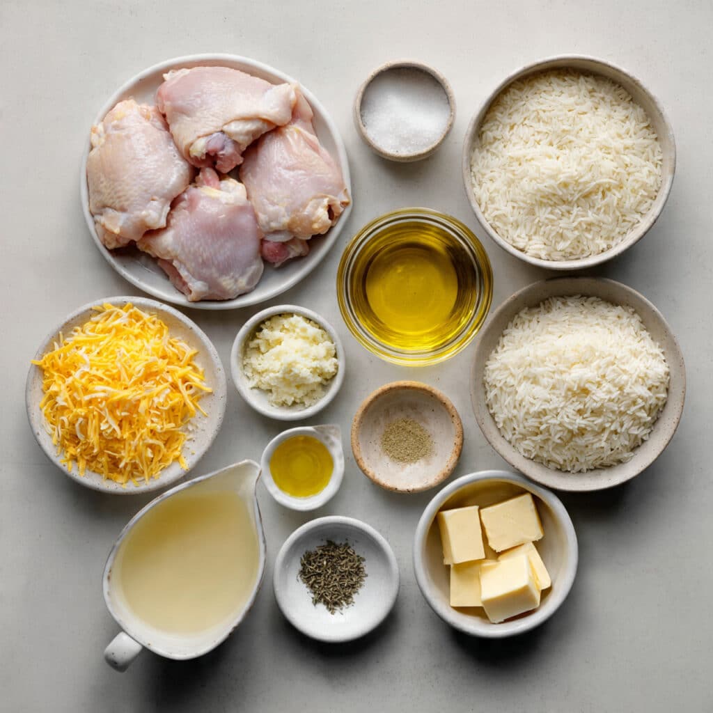 - Combine Ingredients: In a large bowl, mix the uncooked rice, chicken broth, heavy cream, melted butter, chopped onion, minced garlic, salt, black pepper, and dried thyme until well combined.