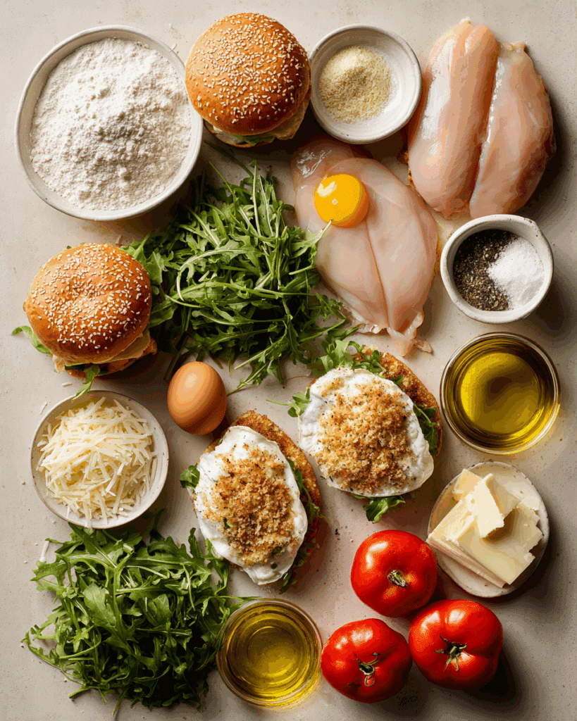 - Serve and Enjoy: Place each chicken cutlet on a bun. Top with a generous scoop of salad and a few Parmesan shavings if using. Serve warm.