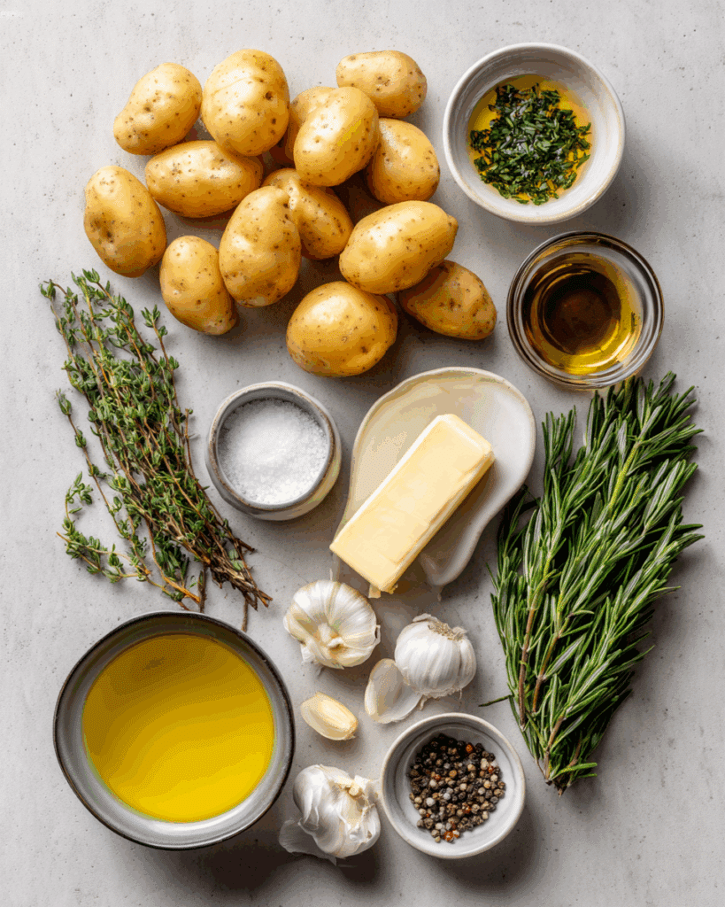 - Combine Ingredients: In a mixing bowl, toss the halved potatoes with olive oil, melted butter, garlic, rosemary, thyme, salt, and pepper until evenly coated.