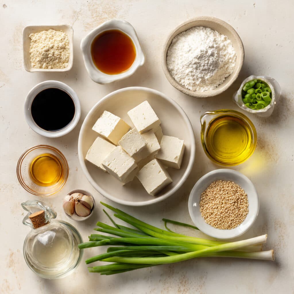 - Extra-firm tofu: 14 oz block, drained and cubed. It’s the star – protein-packed and ready to crisp.