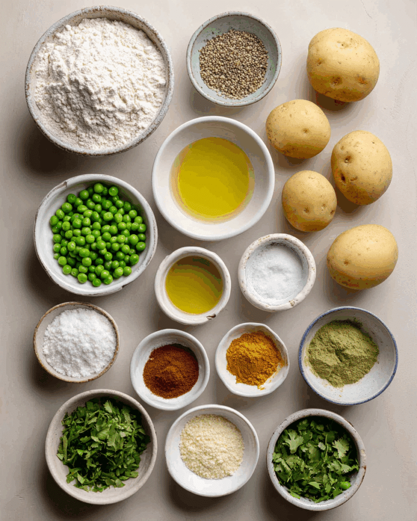 - Combine Ingredients: In a bowl, mix flour, semolina, ajwain, salt, and oil. Gradually add cold water and knead into a smooth, firm dough. Cover and let it rest for 30 minutes. Meanwhile, mash potatoes and mix with peas, spices, ginger, chilies, and cilantro.