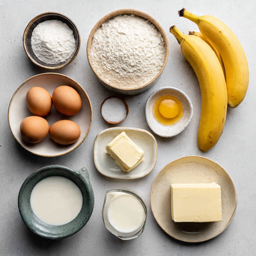In one bowl, whisk together the flour, baking powder, salt, and sugar. In another, whisk the eggs, milk, melted butter, vanilla, and mashed bananas. Pour the wet into the dry and mix gently until just combined. - Prepare Your Cooking Vessel: