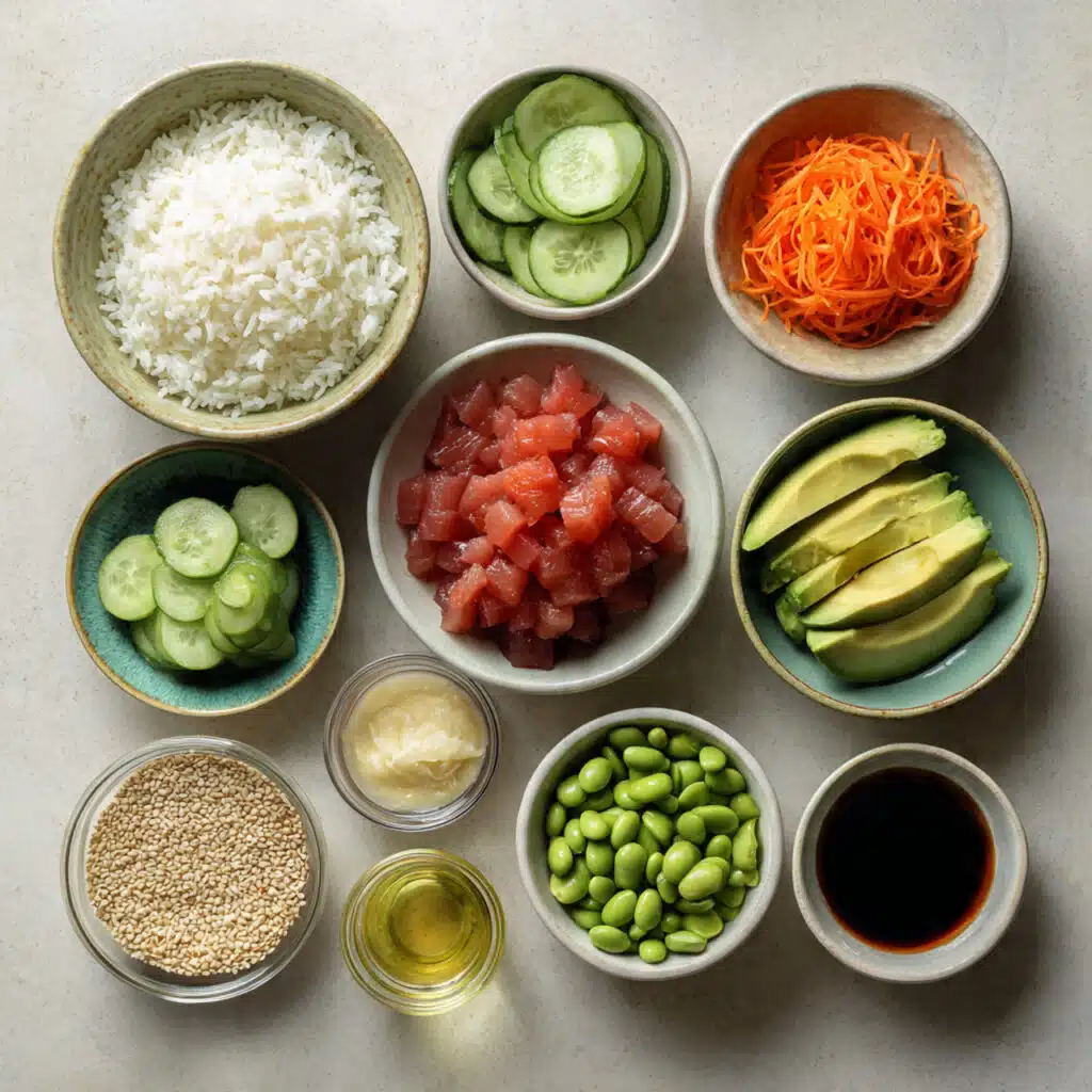 - Assemble the Dish: Add rice to a bowl, then arrange tuna, avocado, cucumber, carrots, and edamame on top.