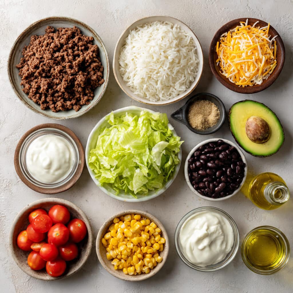 A vibrant and hearty bowl layered with seasoned ground beef, rice, fresh veggies, beans, and creamy toppings. A fun, customizable meal for any day of the week.