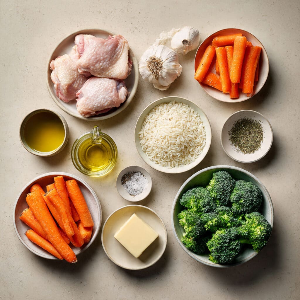 Ingredients in Garlic Butter Chicken with Rice & Veggies