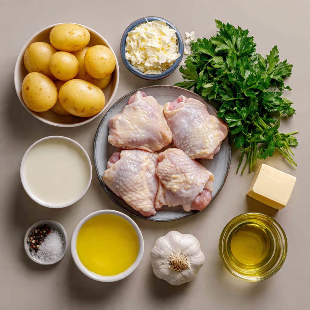 A cozy, creamy baked dish made with tender chicken thighs, golden potatoes, and a garlic-infused cream sauce. Perfect for a comforting family dinner or make-ahead meal.