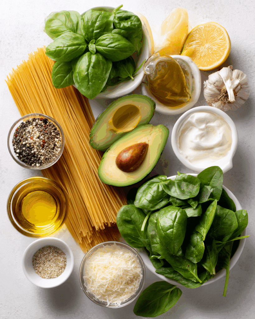 - In a blender or food processor, combine avocado, basil, spinach, garlic, lemon juice, olive oil, Greek yogurt, parmesan, salt, and black pepper. Blend until smooth and creamy.