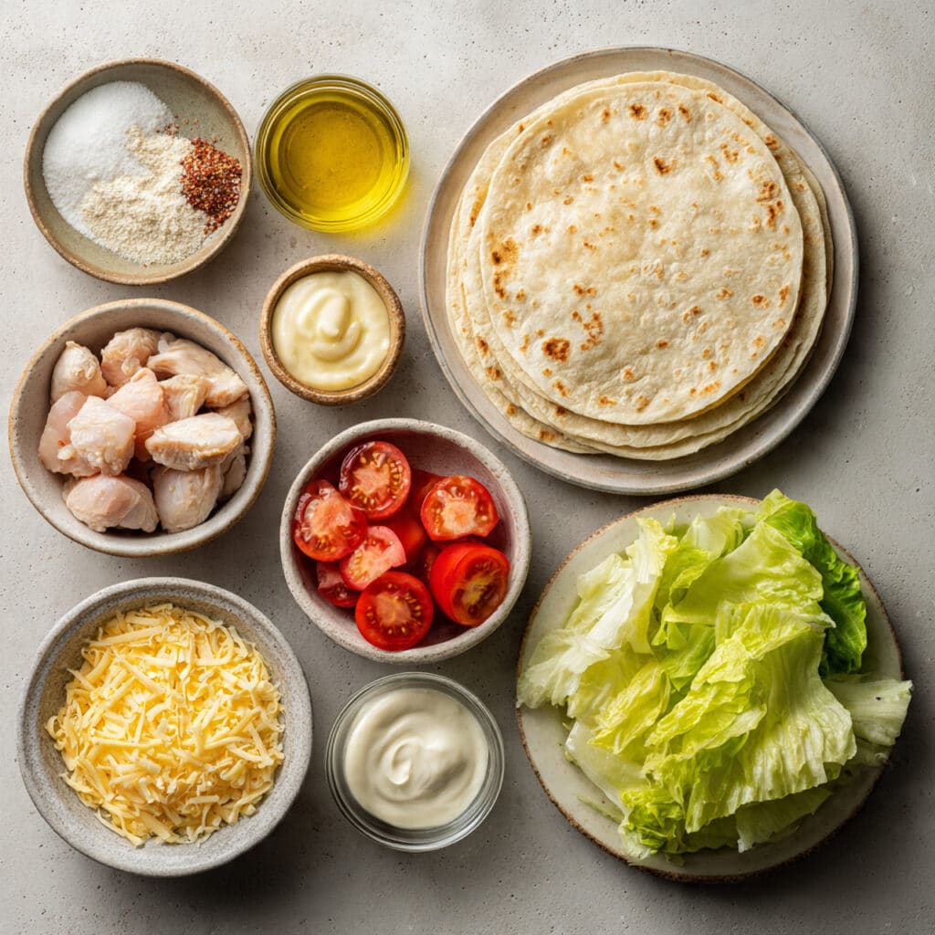 - Chicken Thighs or Breast (boneless, skinless): 2 cups cooked and sliced. Juicy, protein-packed base of the wrap.