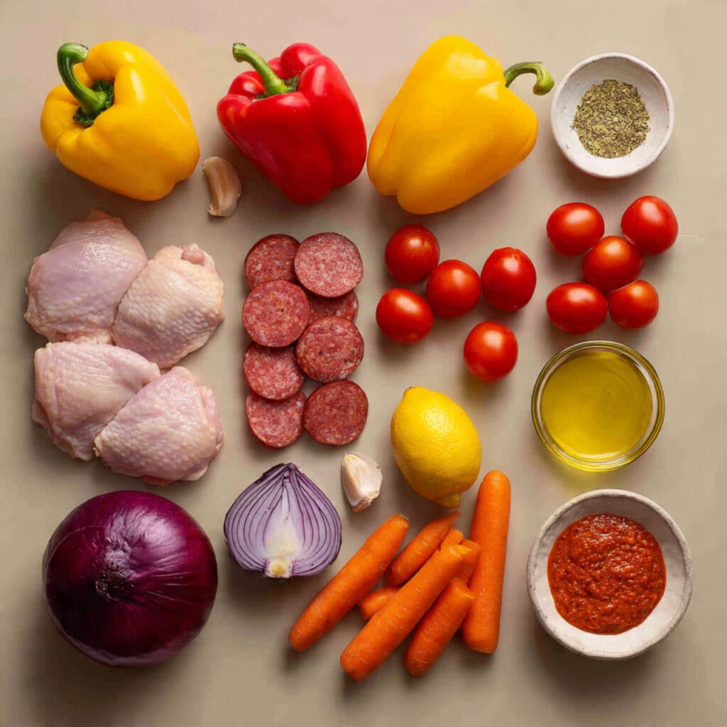 This one came about on a lazy Sunday. I had a pack of chicken thighs in the fridge, a half-used jar of harissa, and some chorizo leftover from a paella night. The idea of juggling multiple pans felt exhausting, so I tossed everything on a tray and crossed my fingers. Forty-five minutes later, I pulled out a bubbling tray layered in spicy, savory goodness. It’s been a favorite ever since — a recipe that came out of necessity but stayed for love.
