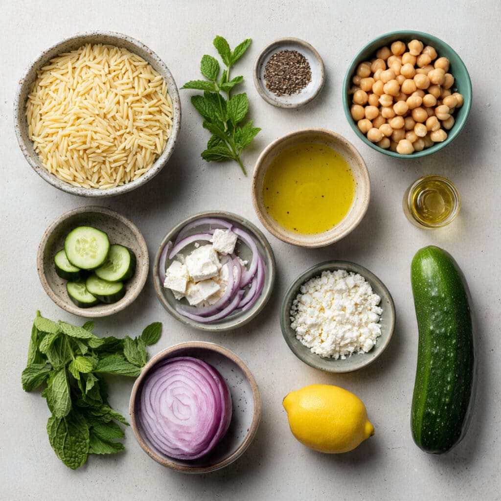 Orzo Pasta: Though it looks like rice, it is pasta, and it soaks up the lemon dressing beautifully while staying pleasantly tender.
