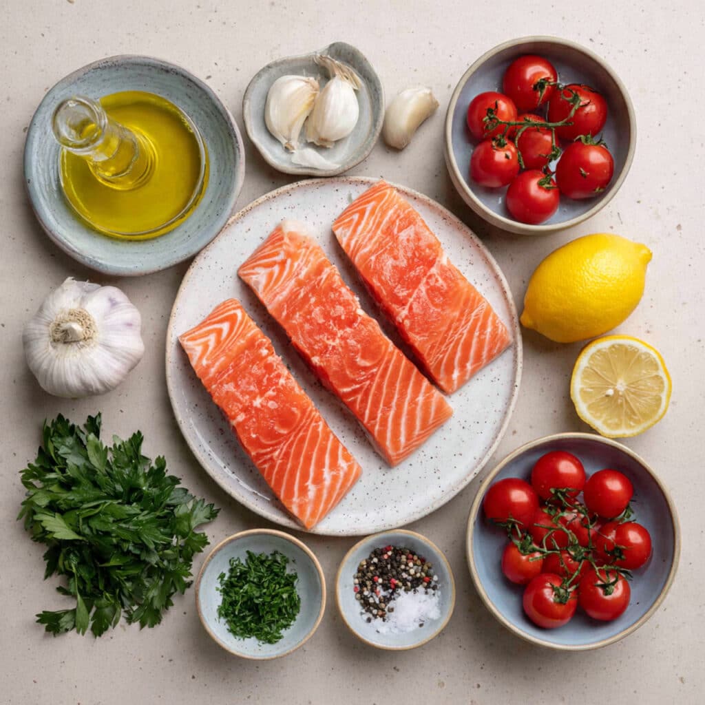 A bright and flavorful one pan salmon dish baked with fresh lemon, garlic, and juicy cherry tomatoes. This easy oven recipe delivers tender, flaky salmon with minimal prep and maximum flavor, perfect for a quick weeknight dinner.