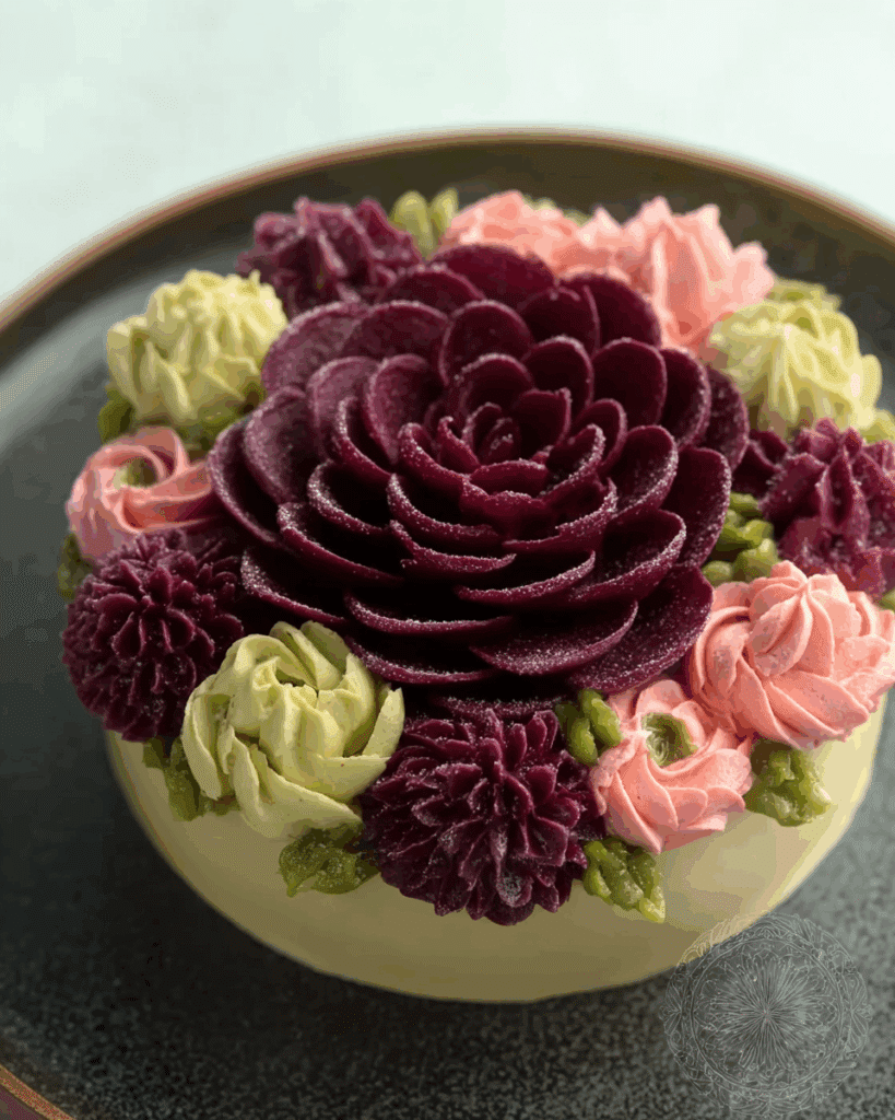 This cake deserves to be the centerpiece of any table. Serve it with a pot of fragrant green tea, delicate fruit platters, or alongside sparkling non-alcoholic drinks. A slice of this floral beauty feels like a celebration in itself.