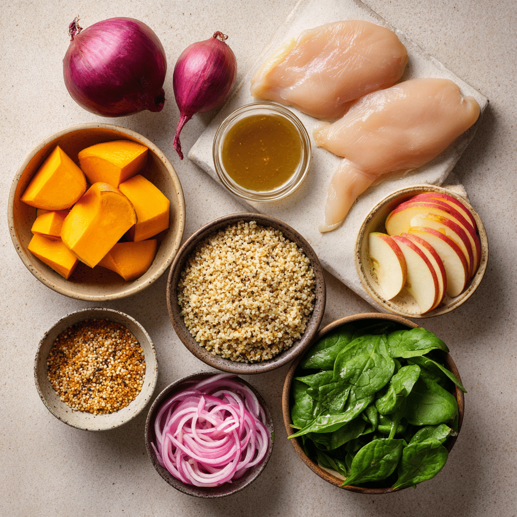A comforting and vibrant fall-inspired bowl featuring maple-glazed chicken, roasted sweet potatoes, quinoa, fresh apple slices, and a tangy Dijon vinaigrette.