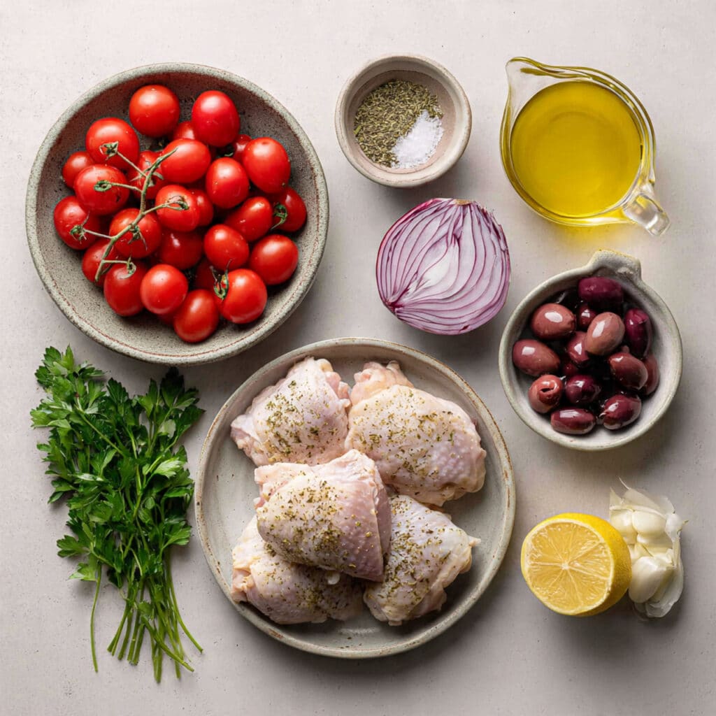 A vibrant, oven-roasted dish featuring juicy chicken thighs, cherry tomatoes, Kalamata olives, and zesty lemon, all brought together with herbs and olive oil for a true Mediterranean experience.