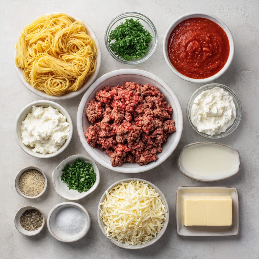 A rich and comforting baked pasta layered with tender spaghetti, savory ground beef marinara sauce, and a creamy blend of ricotta, cream cheese, and sour cream, all topped with melted mozzarella and Parmesan for a golden, bubbly finish.