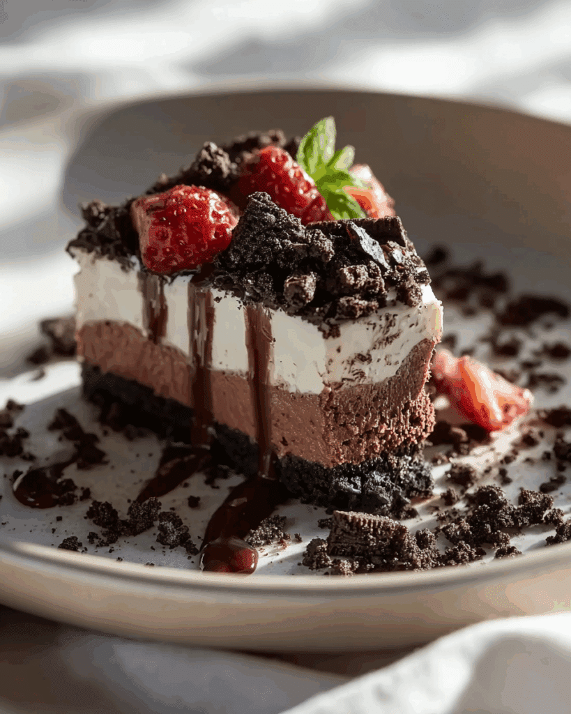A rich, creamy, and no-bake dessert layered with crushed Oreos, chocolate pudding, cream cheese, and whipped topping—perfect for any chocolate lover.