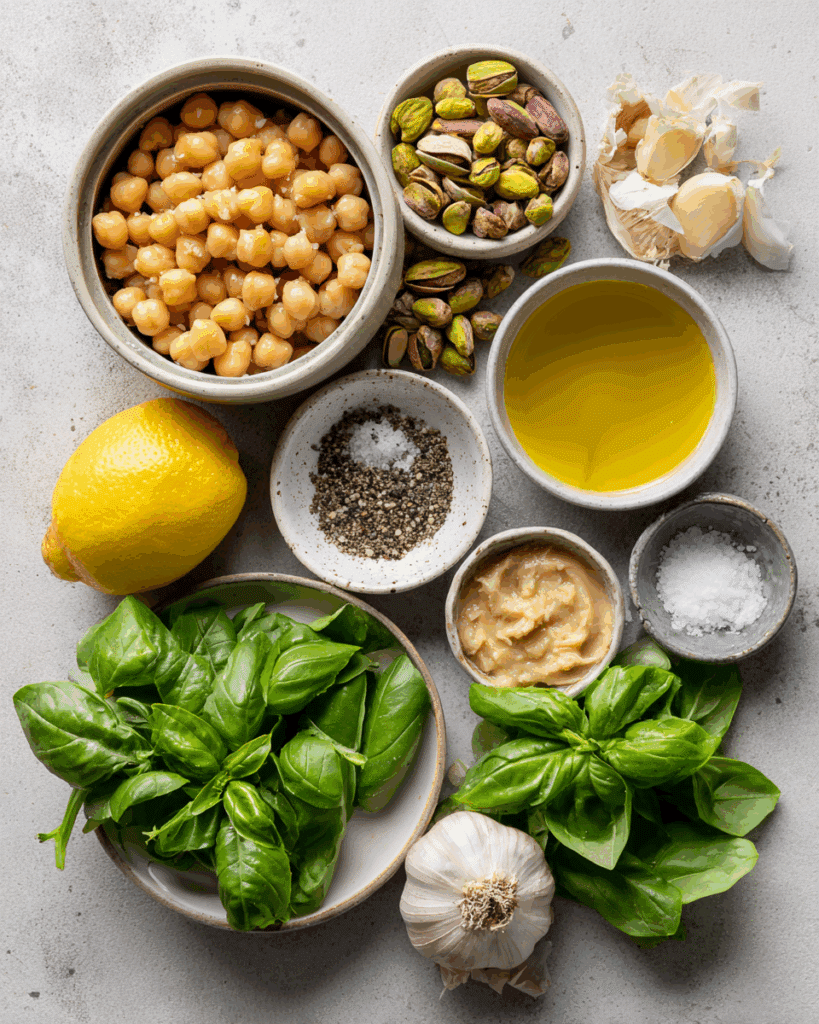 - Combine Ingredients: Add chickpeas, pistachios, basil, garlic, tahini, lemon juice, olive oil, and salt to the food processor.