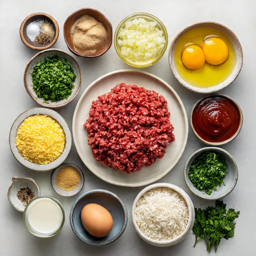 - Long-Grain White Rice: 1/2 cup uncooked long-grain white rice, this cooks inside the meatballs and creates the signature texture.