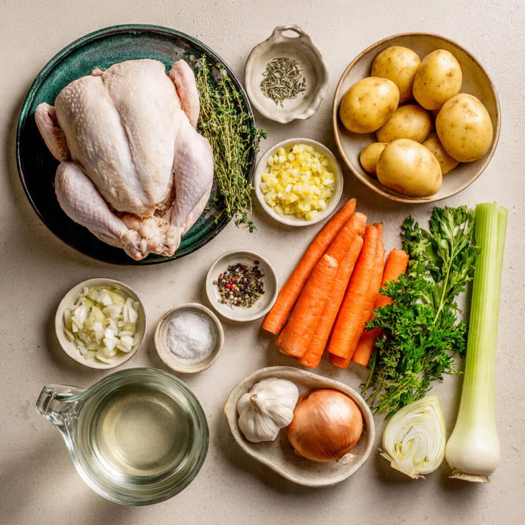 Keywords: poule au pot, chicken in a pot, french chicken stew, poached chicken, rustic french dinner, chicken and vegetables, broth-based chicken recipe