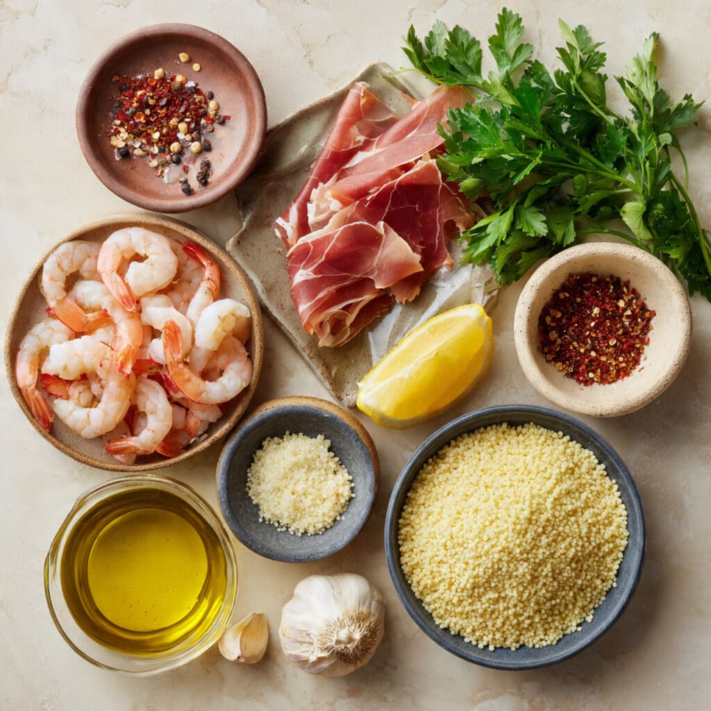While this particular dish might not trace back to a single country’s tradition, its components are rooted in Mediterranean flavors. Prosciutto, the dry-cured Italian ham, is beloved across Europe, especially in Italian cuisine. Shrimp is a seafood staple along coastal Mediterranean regions, and couscous — a fluffy semolina grain — hails from North Africa, particularly Morocco and Tunisia. Combining these elements creates a fusion-style meal that honors their origins while blending them into something delightfully modern.