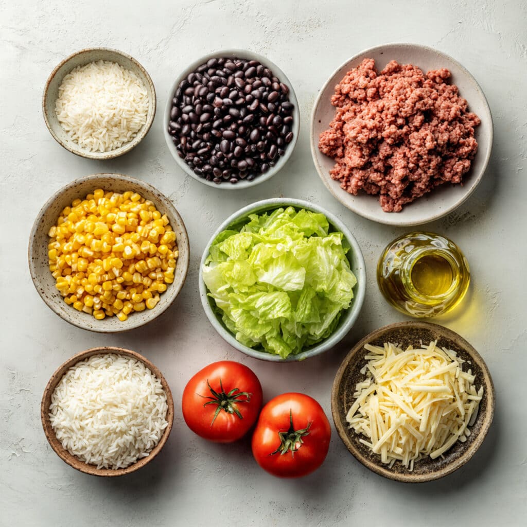 - Assemble bowls by layering rice, seasoned beef, beans, corn, tomatoes, lettuce, and shredded cheese.