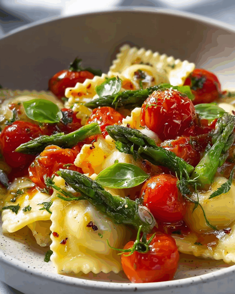 A vibrant and comforting dish of cheese ravioli tossed with blistered cherry tomatoes, crisp asparagus, garlic, and fresh herbs. Ready in under 30 minutes, it’s the perfect quick and elegant meal.