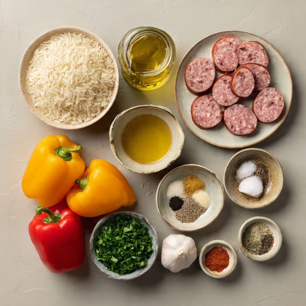 A hearty one-skillet dinner made with browned sausage, fluffy rice, sweet bell peppers, onion, garlic, and warm spices. It is comforting, colorful, and perfect for a quick family meal.