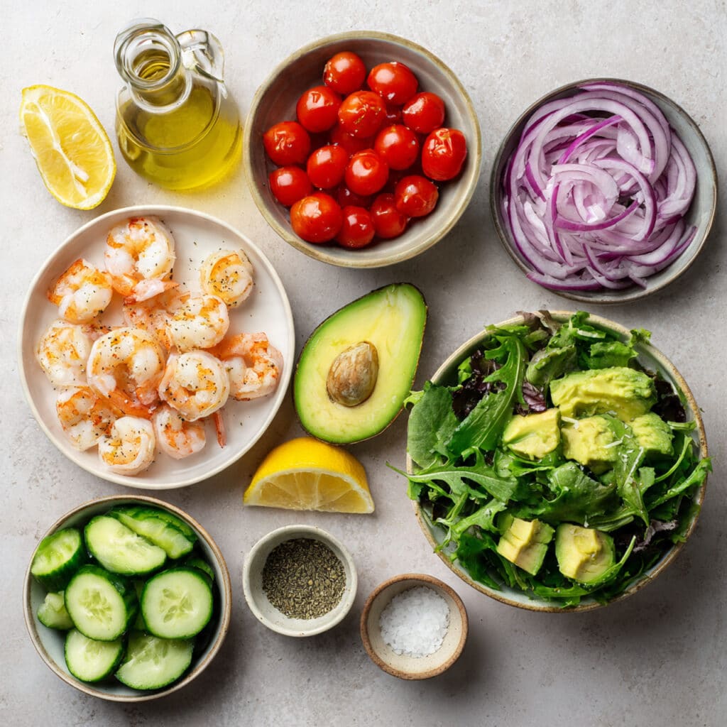 This dish is all about balance. The shrimp is juicy and slightly briny. The cucumber and onion bring a crisp bite. Avocado melts across your tongue while the lemon dressing lifts everything with its tangy brightness. The greens add body and make each forkful a mix of soft, crunchy, and creamy textures. It’s a full sensory experience in every bite.